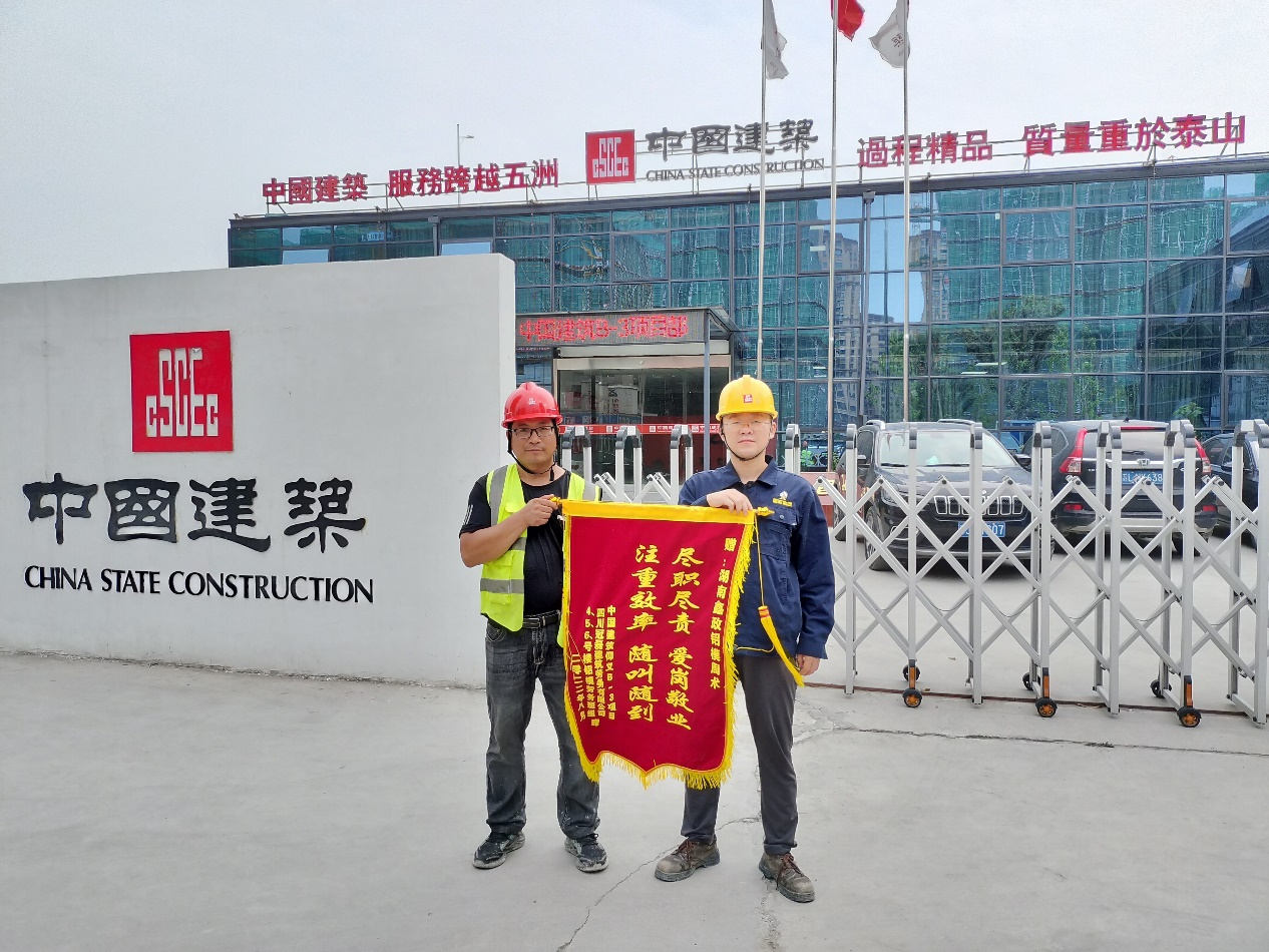 項(xiàng)目現(xiàn)場(chǎng)負(fù)責(zé)人為鑫政工程服務(wù)師周術(shù)(右一)送來錦旗溫州市鹿城區(qū)仰義街道B-3地塊項(xiàng)目,是鑫政集團(tuán)與戰(zhàn)略客戶四川冠鑄今年合作的第五個(gè)項(xiàng)目之一。仰義B-3項(xiàng)目六棟樓,均由鑫政鋁業(yè)提供全套體系模板和首三層安裝指導(dǎo)服務(wù)。目前,鑫政已配合項(xiàng)目4#樓建設(shè)完工,其他樓均已建設(shè)過半,項(xiàng)目整體進(jìn)程順利。